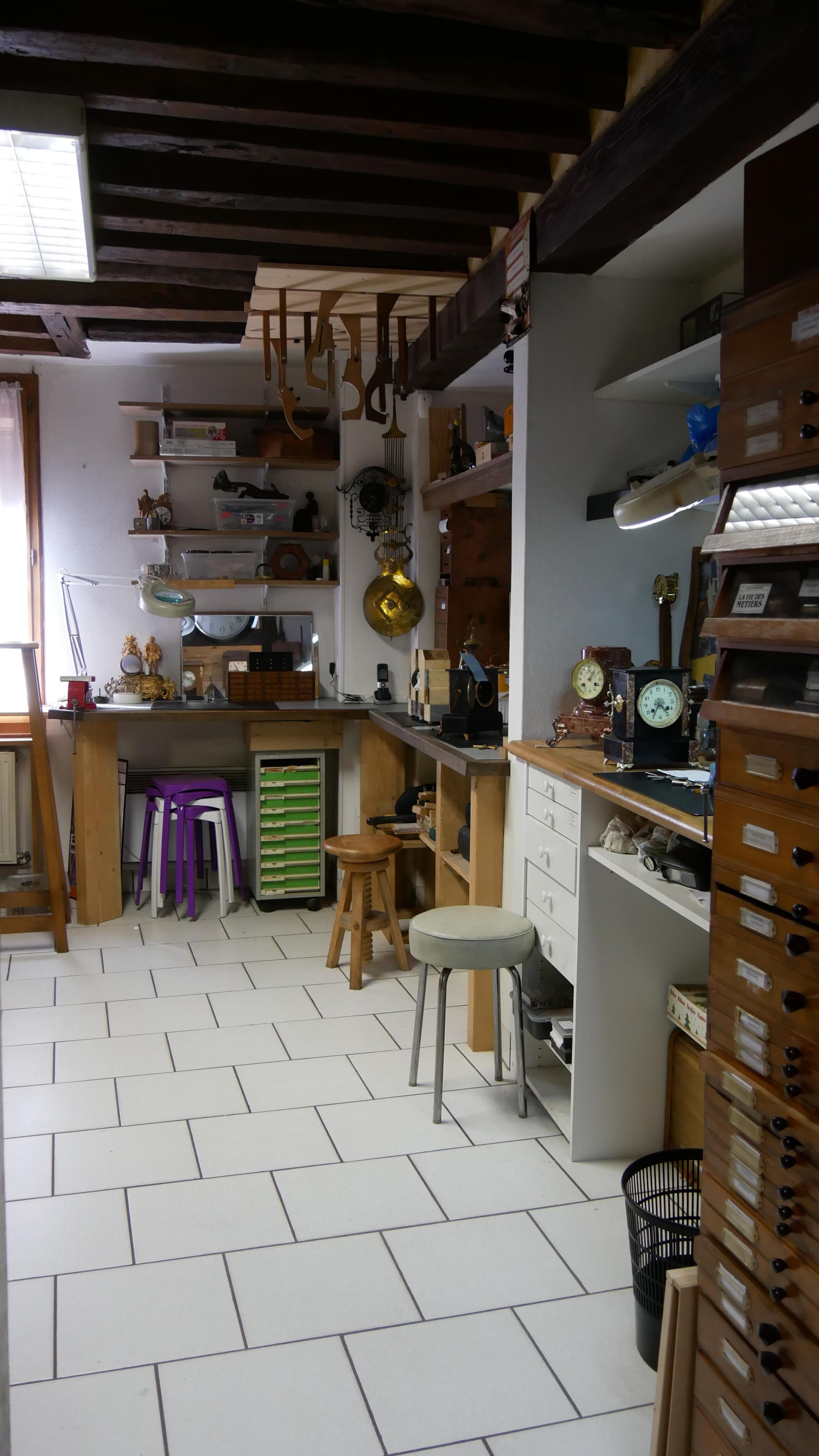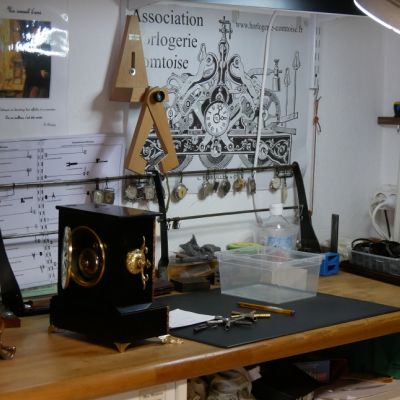 Dans un local attenant au musée en tant qu'adhérent, vous disposez de matériels et d'outillage d'horlogerie et surtout de conseils éclairés des membres. Vous pouvez pratiquer votre loisir sous toutes ses formes : documentations , explications, travail de nettoyage, remise en état (rhabillage), réparation ...etc.