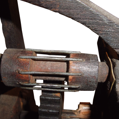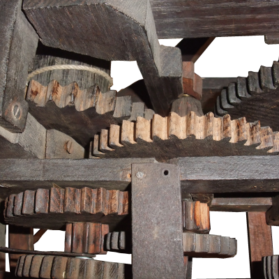 Il est composé d’un mouvement entre deux platines, l’énergie est fournie par un poids logé dans un cabinet qui entraîne un barillet par une corde. Un carré sur ce barillet permet le remontage du poids.