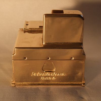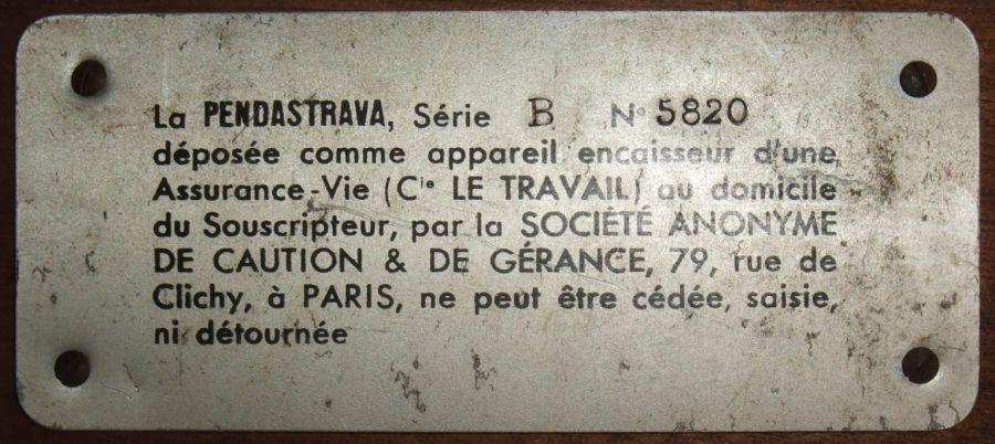 Cette pendule conçue dans les années 1930 est équipée d'un monnayeur qui installée chez un client devait recevoir, pour fonctionner, tous les jours une pièce de 2 francs. Ainsi le client épargnait progressivement une somme qui était relevée régulièrement par la compagnie d'assurance "Le Travail" qui, en contre partie, offrait une assurance-vie.