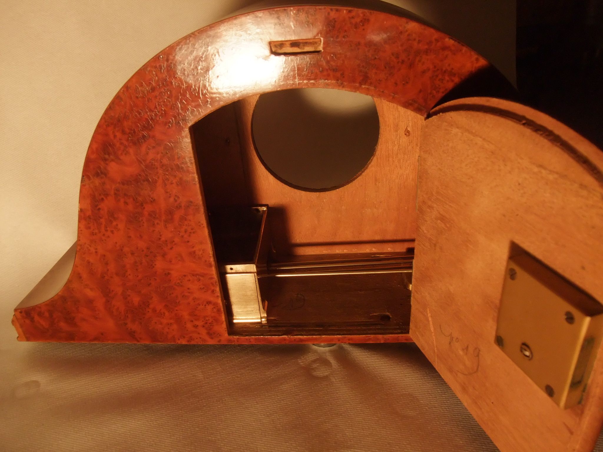 L'ensemble est en mauvais état, elle a du séjourner longtemps dans une remise, l'ébénisterie a beaucoup souffert, il y a des manques aux couvre joints qui protègent la vitre et les fixés sous verre, donc pour une bonne restauration tous les couvre joints ont été remplacés par des nouveaux, copiés au millimètre près et réalisés en noyer par le "spécialiste bois" de l'équipe de restauration.
