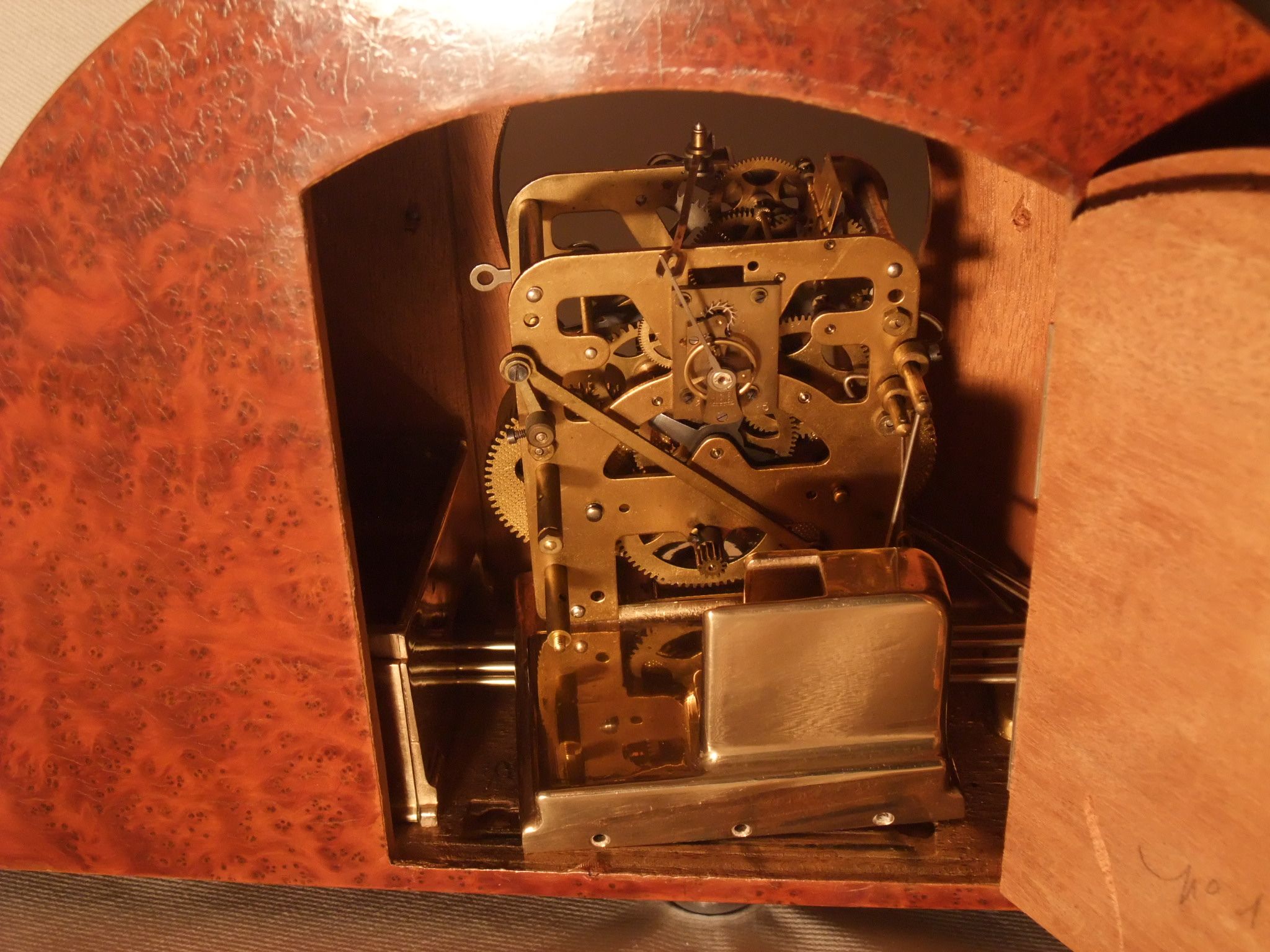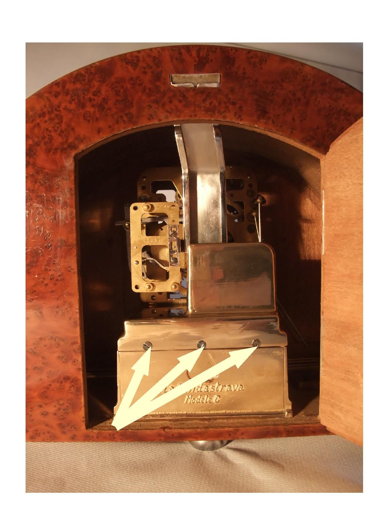 L’angélus, composé de trois fois trois notes puis d’une volée, est réalisé par l’intermédiaire des cames qui agissent sur deux marteaux frappant deux gongs : le premier est utilisé pour la répétition des trois fois trois notes identiques, les deux gongs pour la volée. La régulation est effectuée par un volant aérodynamique.
