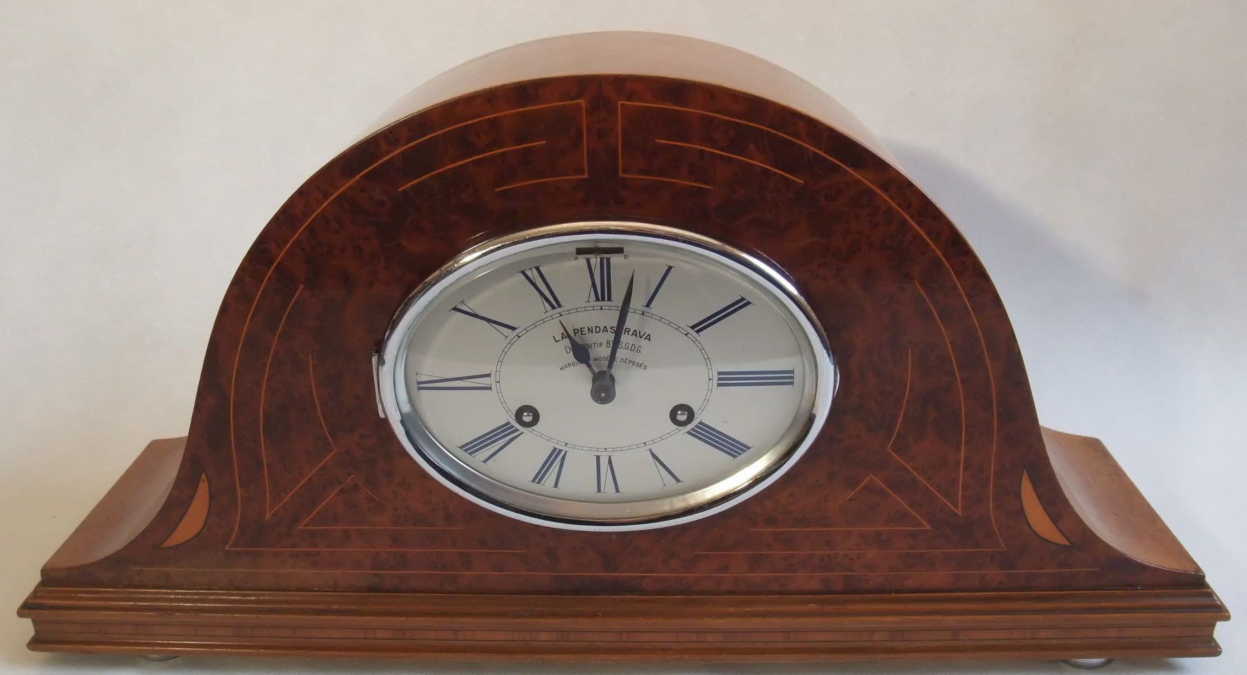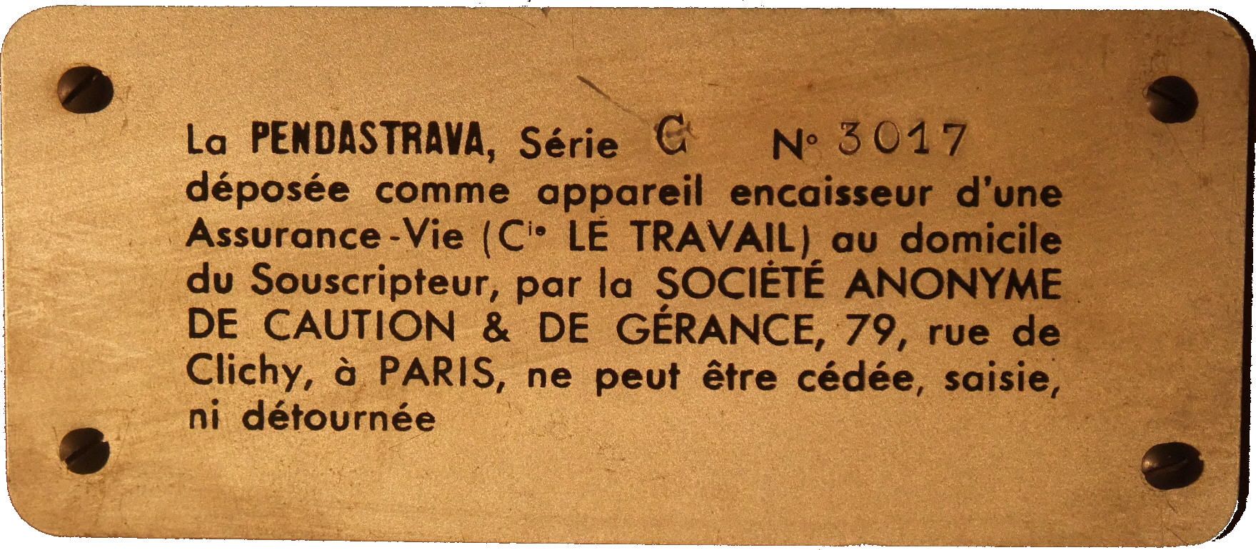 Cette honorable Société fait délivrer gratuitement, par sa Société anonyme de Caution et de Gérance (au capital de 6.500.000 francs), une pendule des plus artistiques, a tous les souscripteurs d'une Assurance-Vie-Décès, de la Compagnie Le Travail. C'est une nouveauté, et l'on va voir en quoi consiste son originalité. Décrivons d'abord cette pendule qui a pour nom : La Pendastrava et qui est visible pour ceux qu'elle intéresse dans les Bureaux de la Compagnie Le Travail, 79, rue de Clichy, à Paris. Cette belle pendule est en thuya, marqueterie citronnier, filet bois de rose, mouvementà quinzaine à sonnerie, cadran ovale argenté (type A), mouvement à huitaine, cadran rond argenté (type B), heures bleu de roi, lunette et pieds de bronze. Au sommet, se trouve une fente destinée à recevoir des pièces de monnaie, analogue à celles qui existent dans les appareils distributeurs qu'on trouve dans toutes les gares. Or, cette pendule — un vrai bijou — ne fonctionne, mêne remontée, que si elle a reçu chaque jour une pièce de un franc ou deux francs.
