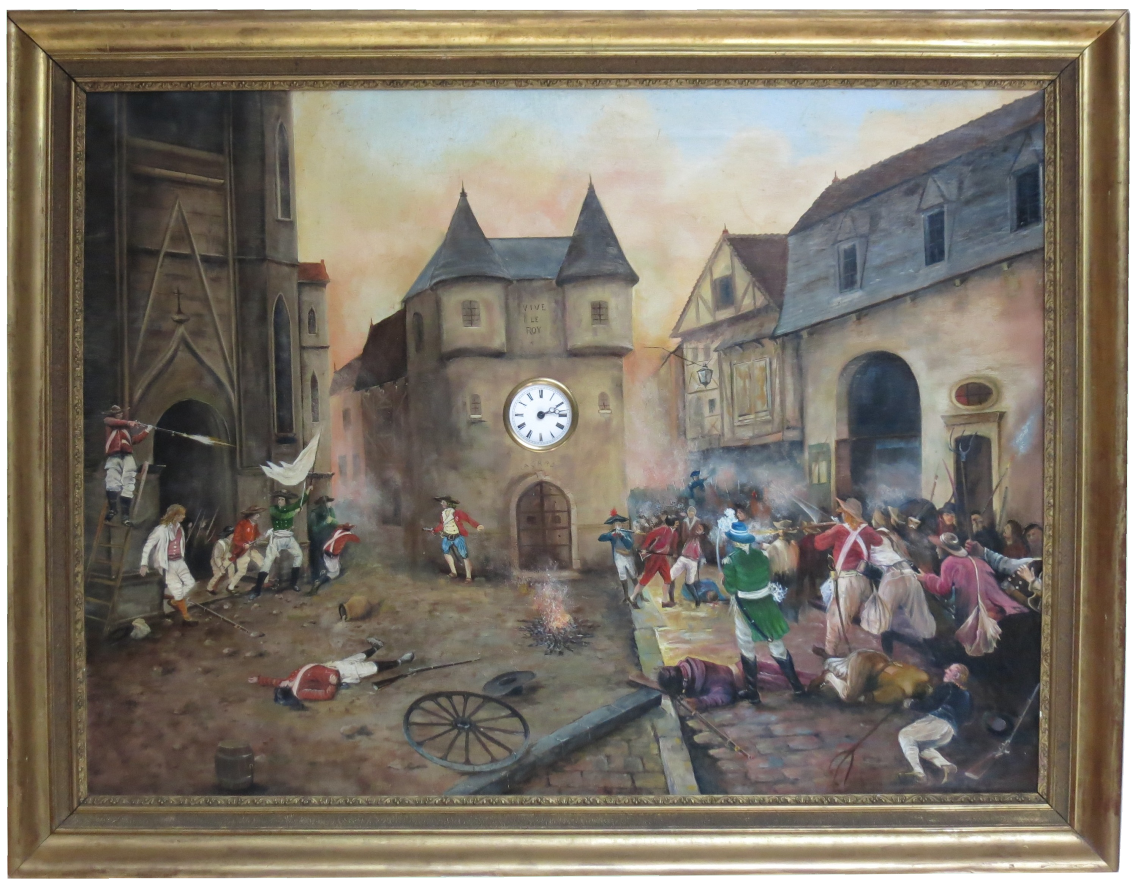 La peinture de notre tableau représente un épisode de la bataille de Cholet. Cette bataille est un tournant dans la guerre de Vendée qui, par ailleurs, est restée un sujet discrètement présent dans notre histoire. C’est la révolte de paysans qui ne supportent pas la « nationalisation » de l’église de France à marche forcée menée par la convention à partir de juillet 1790 et choqués de voir le roi guillotiné. Le feu aux poudres est mis avec la conscription de soldats pour les armées du Rhin. Les paysans de l’ouest, entre Loire et océan se révoltent : ils ne veulent pas mourir pour la Convention, le 10 mars 1793 les gardes nationaux tirent sur les réquisitionnaires en révolte, le 15 mars les paysans insurgés prennent la ville de Cholet. C’est le début d’une répression terrible, avec trois cent mille morts sur une population de cinq cent mille personnes.