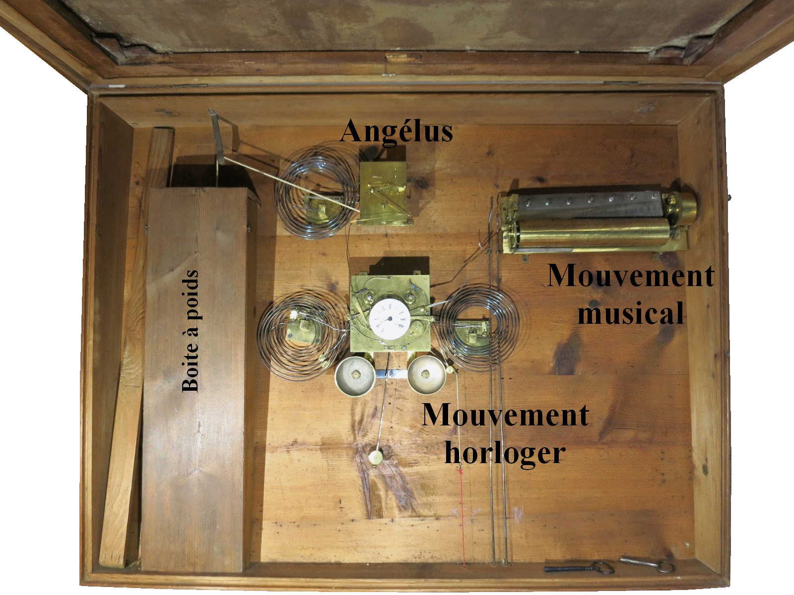 L’observation du coffre du tableau permet de distinguer trois mécanismes principaux : en haut et à gauche un mouvement de sonnerie avec un poids dans un petit cabinet, c’est la sonnerie de l’angélus ; au milieu le mouvement de l’horloge avec un ensemble de timbres et de gongs pour la sonnerie des heures, demies et quarts d’heure, enfin en haut et à droite un mouvement musical avec six musiques séquentielles