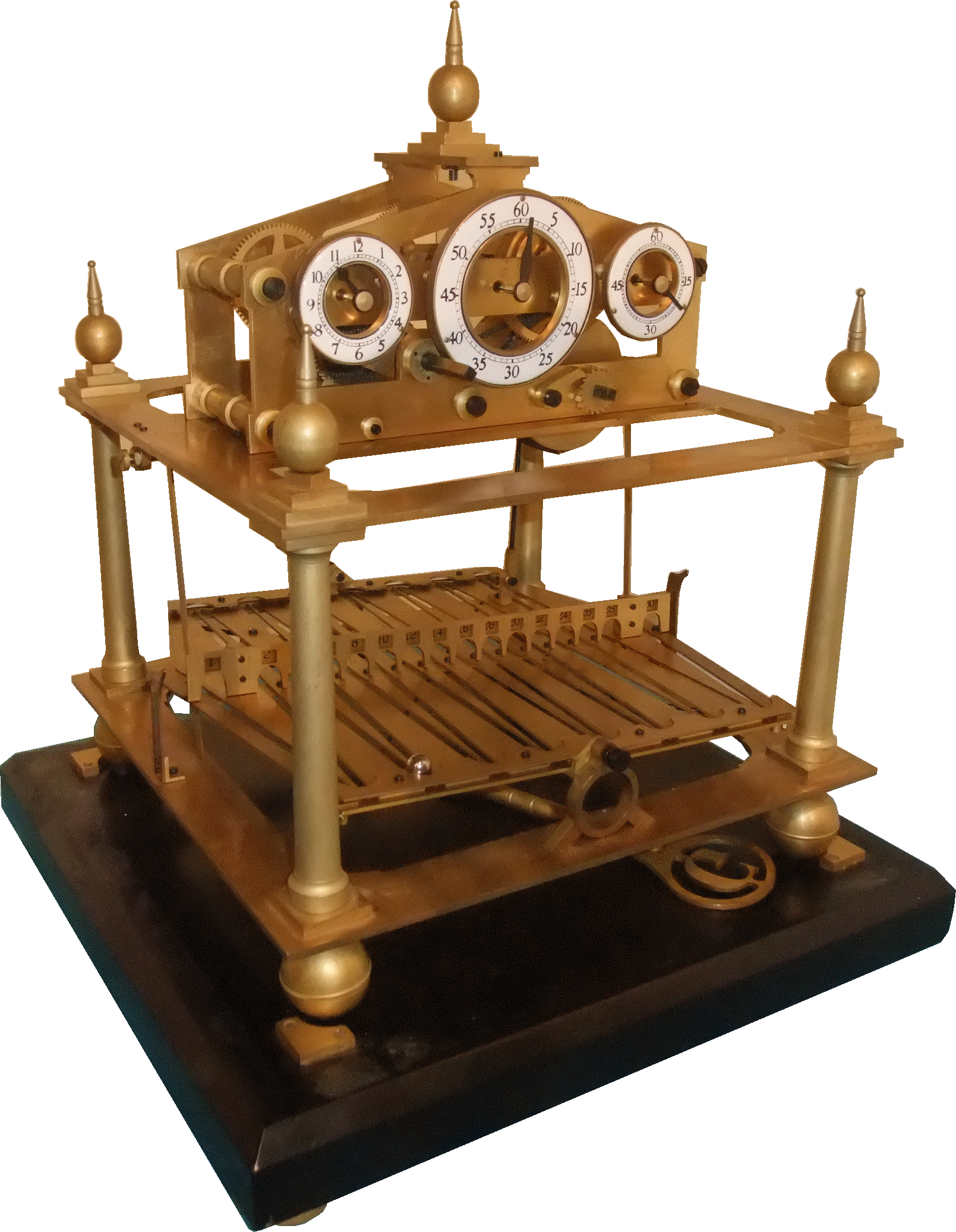 Les trois cadrans indiquent les heures sur la gauche, les minutes dans le milieu et les secondes sur la droite, bien quel'aiguille des secondes de ce cadran se déplace de 60 à 30 il ne montre pas les secondes réelles. Un indicateur plus détaillé des secondes existe sous la forme d'une règle coulissante où les secondes sont indiquées par le biais d'une série de petites fenêtres 1, 2, 4, 6... 30 et, lorsque la table s'incline, cette règle se déplace pour indiquer 31, 32, 34, 36... au passage de la bille.