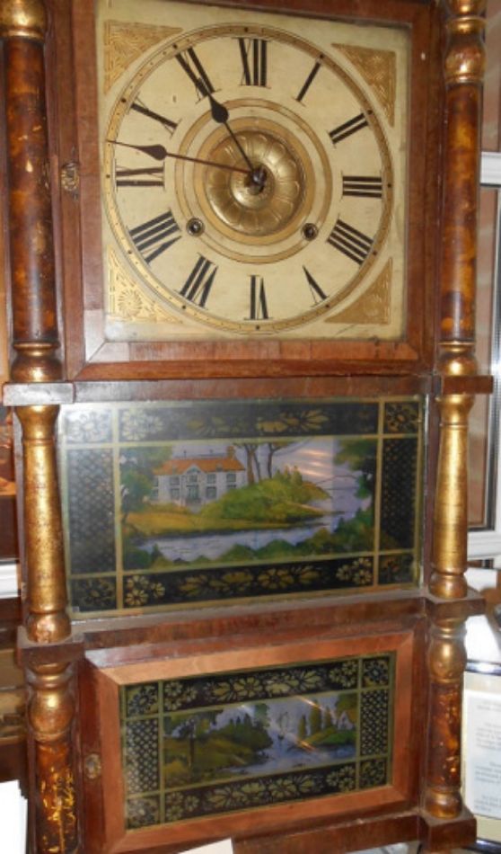 Depuis la fin du XVIII ème siècle des fabriques d'horlogerie avaient vu le jour en Nouvelle Angleterre, principalement dans le Connecticut. Vers 1830 deux frères Chauncey et Noble Jérome fabriquent de curieuses horloges à poser à Bristol dans le Connecticut. D'une hauteur comprise entre 0,8 et 1 mètre ces horloges de table son flanquées de deux colonnes sculptées et en partie dorées et elles sont ornées de deux panneaux décoratifs fait selon la technique du fixés sous verre, le verre est peint sur l'envers cette technique a été très employée en Allemagne pour décorer les certaine horloges de la Forêt Noire.