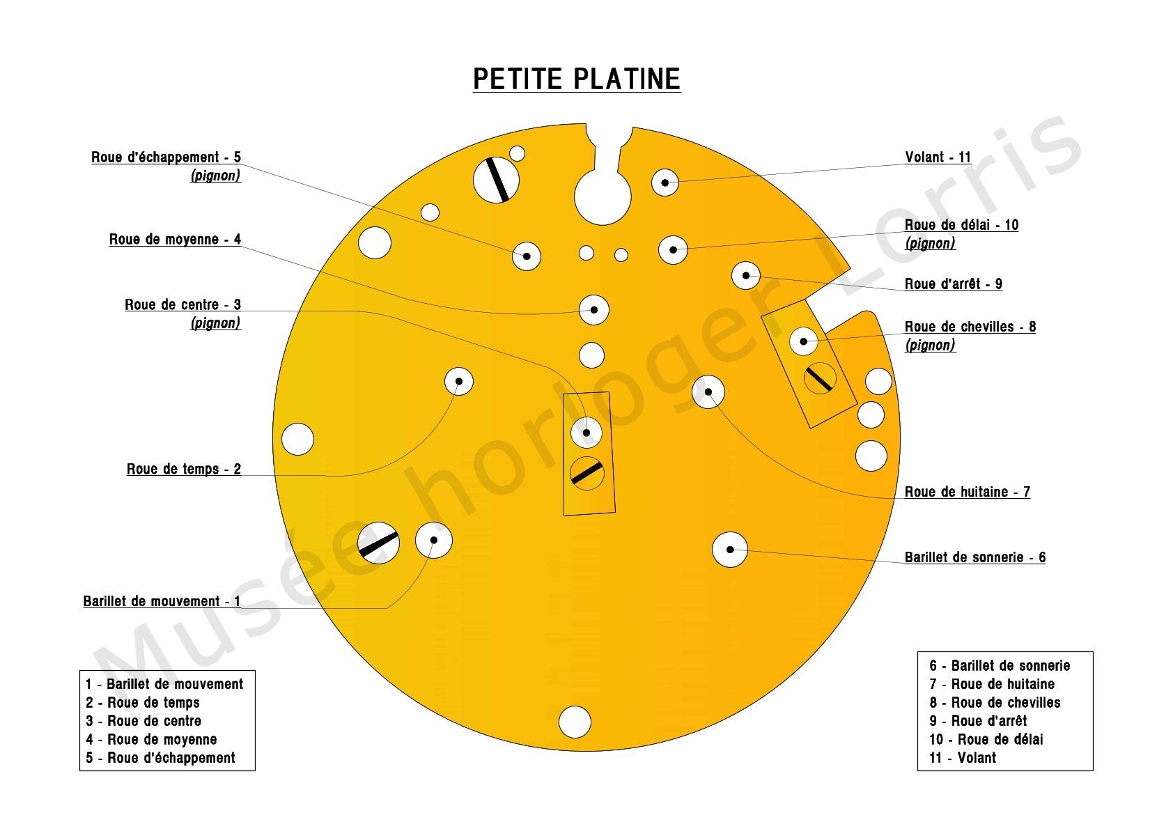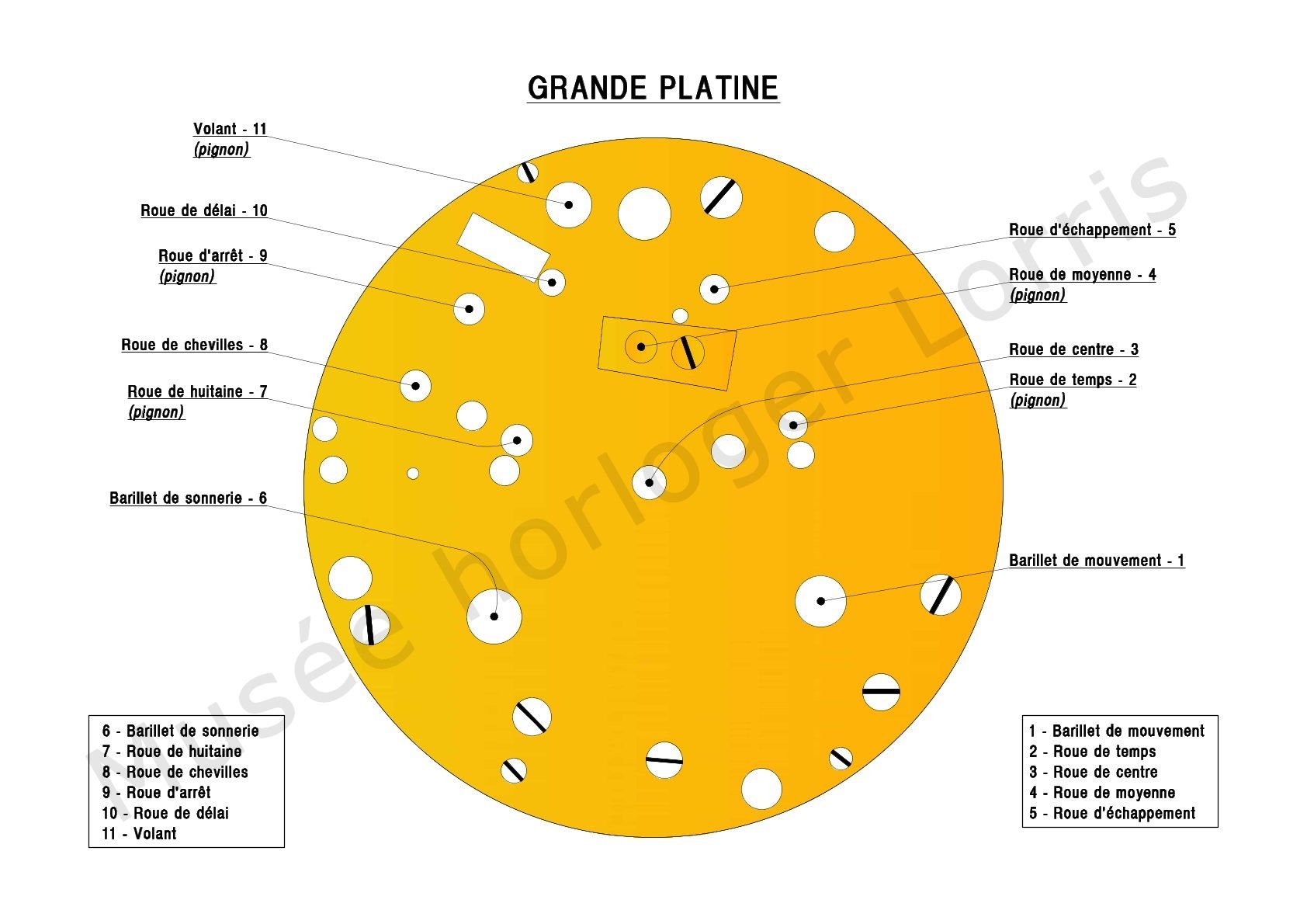 Sur les plus anciennes la platine arrière porte parfois, gravé en magnifiques lettres cursives, le nom de l’horloger et la date sous forme de millésime. La pièce est donc parfaitement identifiée. Dans certains écrits les horlogers de l’époque parlent de la platine du nom ; c’est de la platine arrière qu’il s’agit.