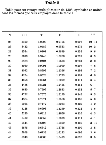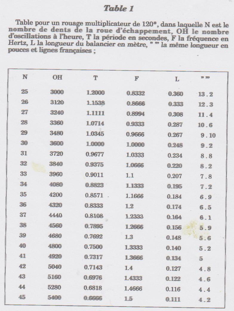 C'est une table qui à été établie pour un rouage multiplicateur de 120, donc avec une roue de centre de 84 dents, une roue de moyenne de 70 dents et pignons de 7 ailes ou avec une roue de centre de 72 dents, une roue de moyenne de 60 dents et pignons de 6 ailes.