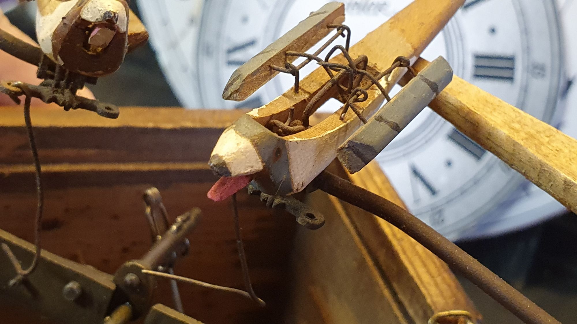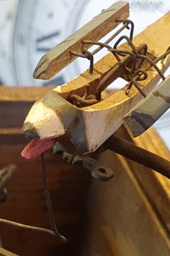 Restauration d'un joli coucou avec un mécanisme à trois soufflets et deux oiseaux.
