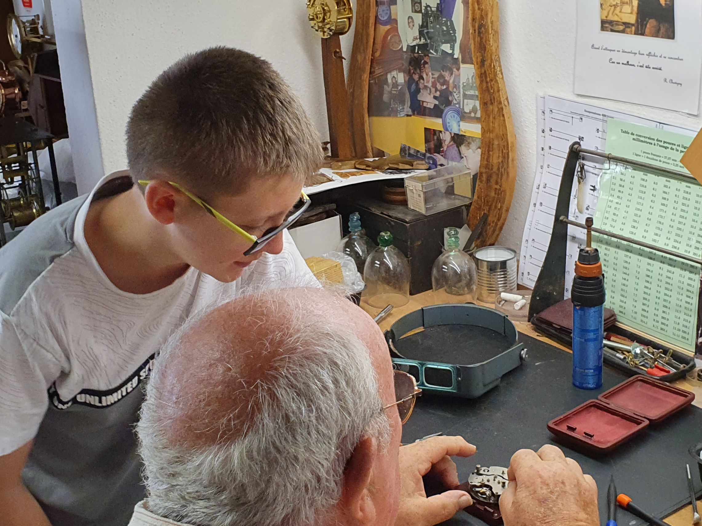 Ici, Ethan avec notre doyen des membres de l'atelier à pendule, Henri. Plusieurs décennies les séparent mais ils ont la même passion...