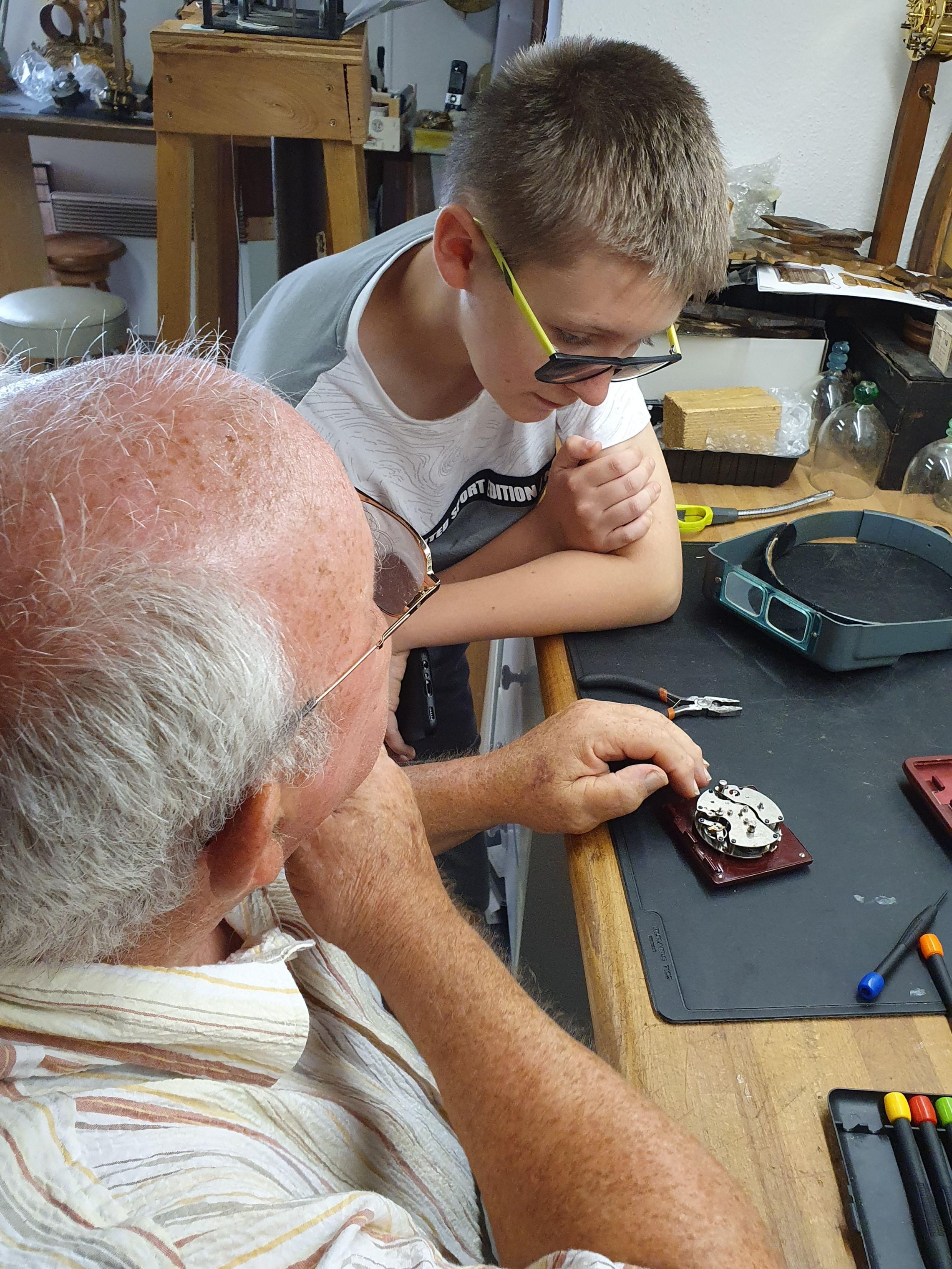 Nous avons la chance d'avoir un jeune adhérent de l'atelier à pendule. Voici notre apprenti profitant de ses vacances pour approfondir ses connaissances, déjà nombreuses, en horlogerie :