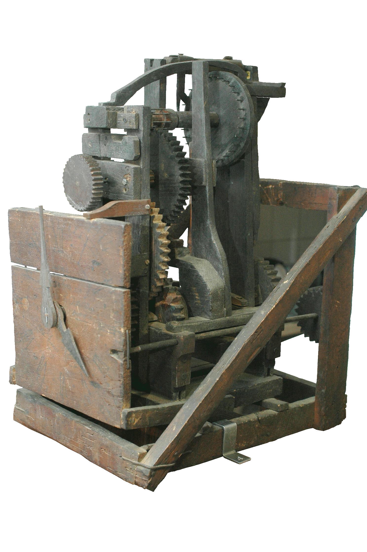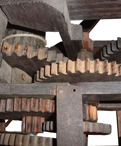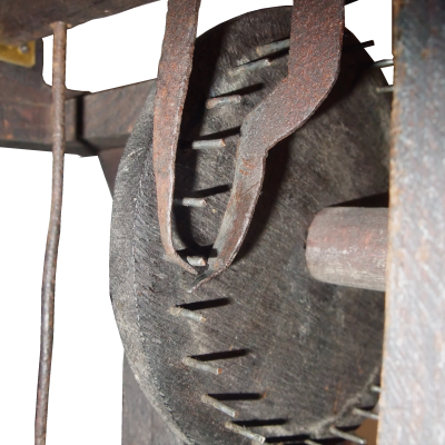 Il est composé d’un mouvement entre deux platines, l’énergie est fournie par un poids logé dans un cabinet qui entraîne un barillet par une corde. Un carré sur ce barillet permet le remontage du poids.