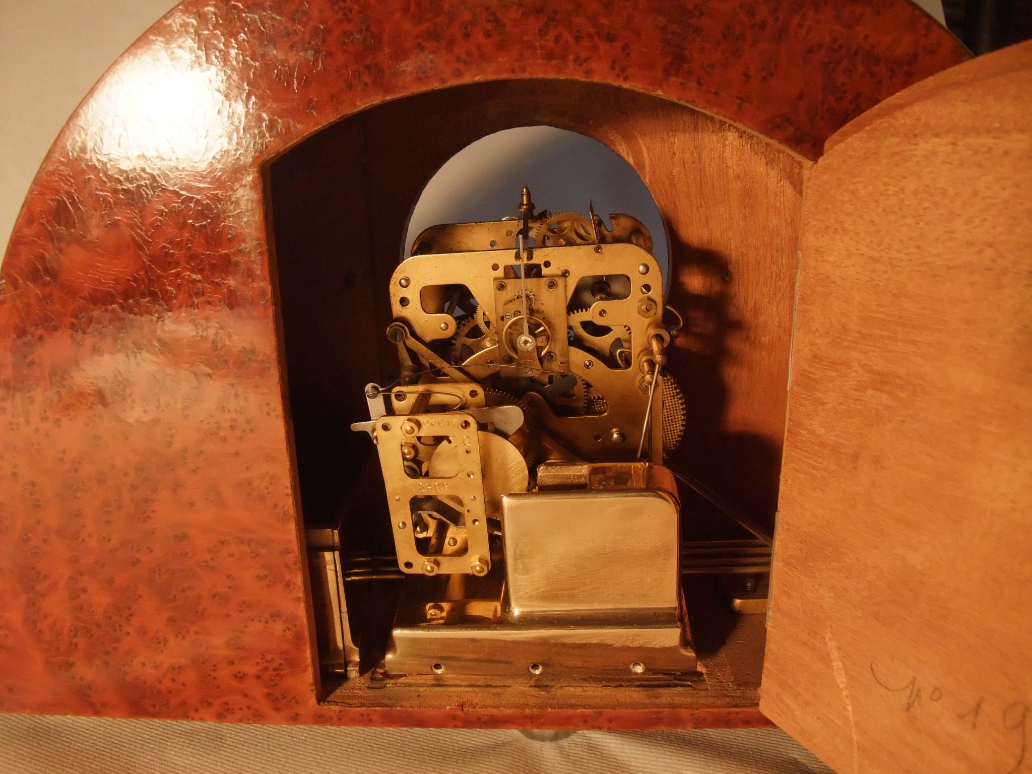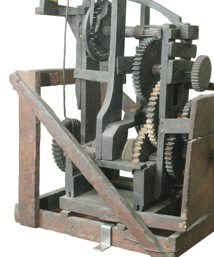 L’observation du coffre du tableau permet de distinguer trois mécanismes principaux : en haut et à gauche un mouvement de sonnerie avec un poids dans un petit cabinet, c’est la sonnerie de l’angélus ; au milieu le mouvement de l’horloge avec un ensemble de timbres et de gongs pour la sonnerie des heures, demies et quarts d’heure, enfin en haut et à droite un mouvement musical avec six musiques séquentielles
