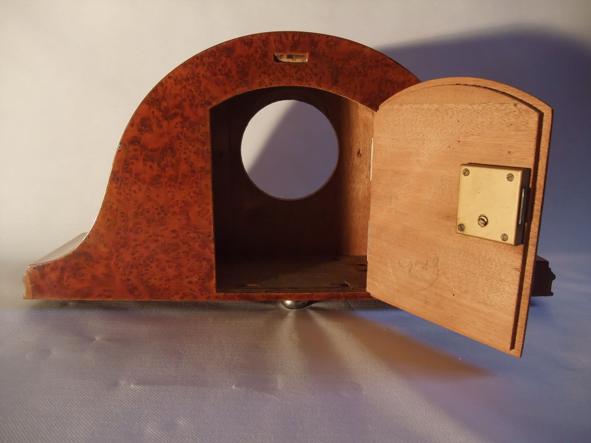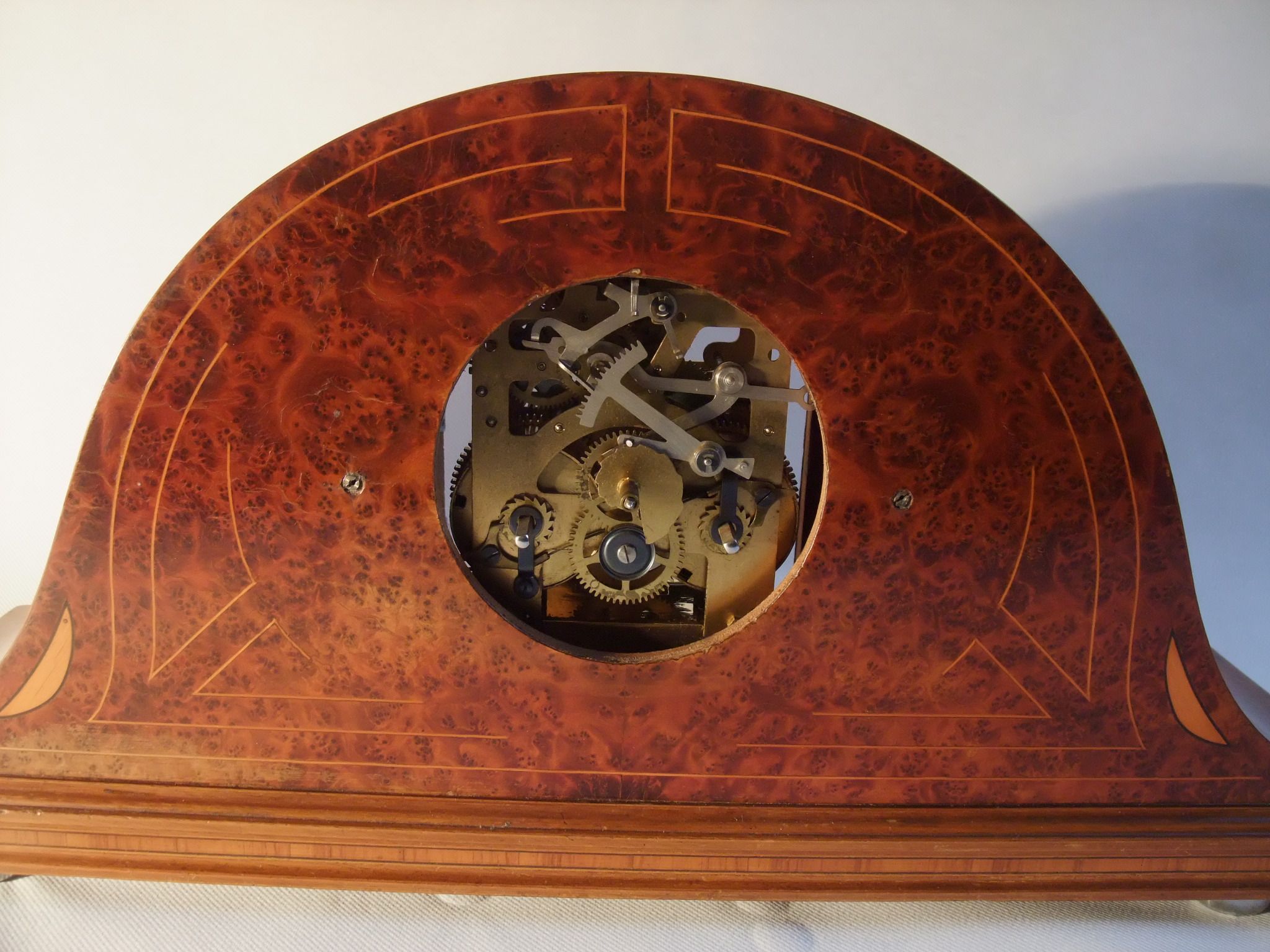 L'ensemble est en mauvais état, elle a du séjourner longtemps dans une remise, l'ébénisterie a beaucoup souffert, il y a des manques aux couvre joints qui protègent la vitre et les fixés sous verre, donc pour une bonne restauration tous les couvre joints ont été remplacés par des nouveaux, copiés au millimètre près et réalisés en noyer par le "spécialiste bois" de l'équipe de restauration.