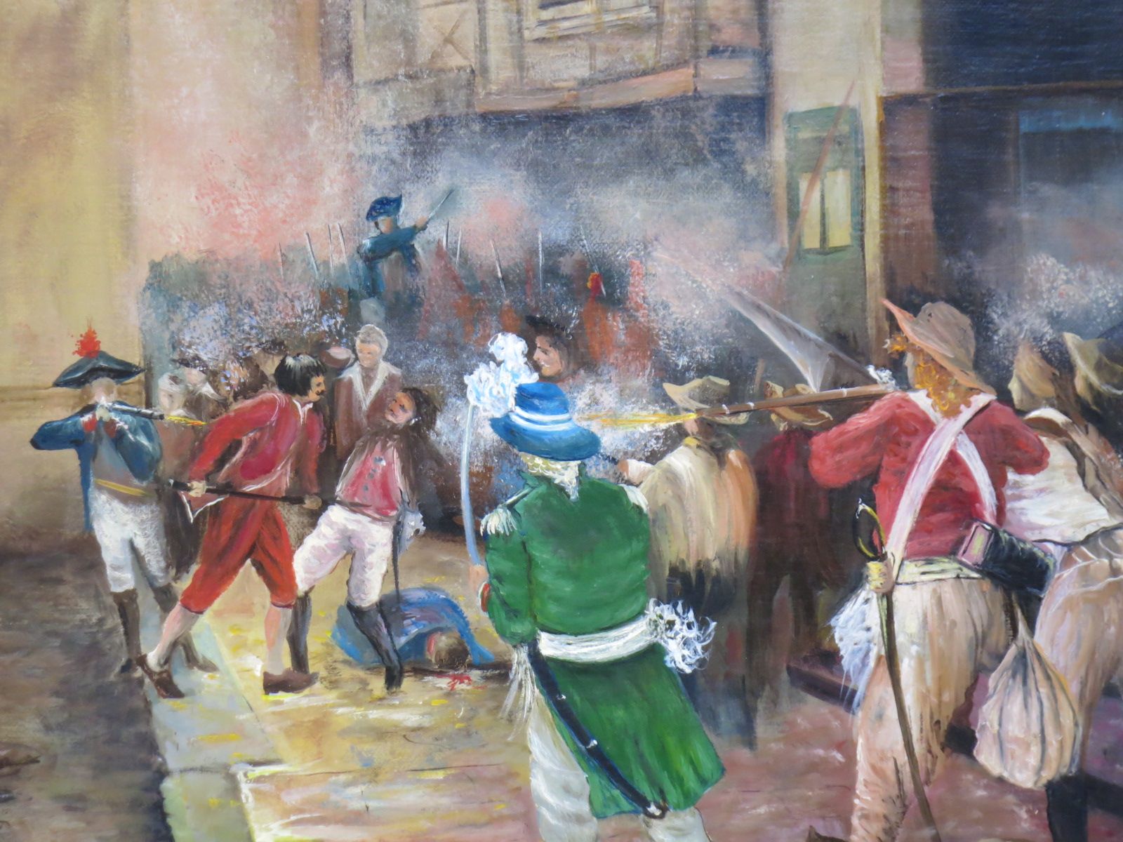 La peinture de notre tableau représente un épisode de la bataille de Cholet. Cette bataille est un tournant dans la guerre de Vendée qui, par ailleurs, est restée un sujet discrètement présent dans notre histoire. C’est la révolte de paysans qui ne supportent pas la « nationalisation » de l’église de France à marche forcée menée par la convention à partir de juillet 1790 et choqués de voir le roi guillotiné. Le feu aux poudres est mis avec la conscription de soldats pour les armées du Rhin. Les paysans de l’ouest, entre Loire et océan se révoltent : ils ne veulent pas mourir pour la Convention, le 10 mars 1793 les gardes nationaux tirent sur les réquisitionnaires en révolte, le 15 mars les paysans insurgés prennent la ville de Cholet. C’est le début d’une répression terrible, avec trois cent mille morts sur une population de cinq cent mille personnes.