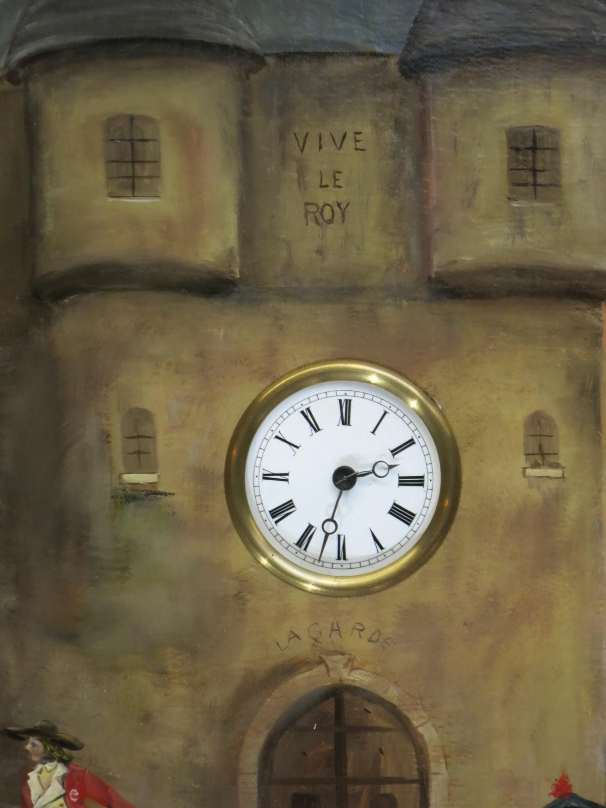 Sur la peinture, l’entrée d’une bâtisse, coiffée de deux tourelles, un cadran d’horloge indique l’heure. C’est un cadran à chiffre romain classique d’un diamètre d’environ 75 mm