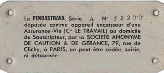 Cette pendule conçue dans les années 1930 est équipée d'un monnayeur qui installée chez un client devait recevoir, pour fonctionner, tous les jours une pièce de 2 francs. Ainsi le client épargnait progressivement une somme qui était relevée régulièrement par la compagnie d'assurance "Le Travail" qui, en contre partie, offrait une assurance-vie.
