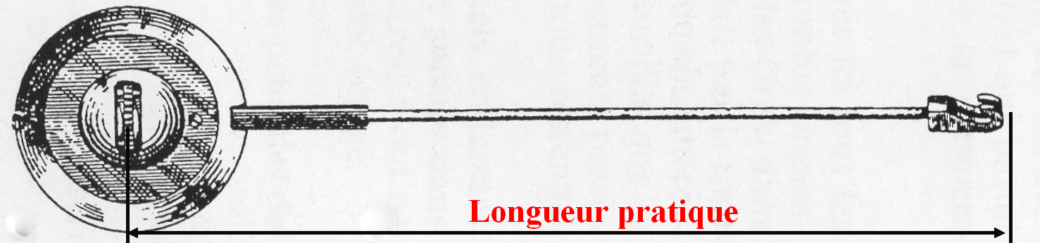 La longueur théorique est la distance entre le centre de gravité du balancier et le point de flexion des lames de la suspension cette distance n'est pas facile à mesurer. La longueur pratique, très facile à mesurer avec précision, est la distance entre le centre de la lentille et le sommet du crochet. Ces deux longueurs sont à peu de choses près identiques il n'y a aucun inconvénient à les confondre. Inutile de se faire des nœuds à la cervelle avec des considérations sur le pendule simple , le pendule composé…. Il vaut mieux laisser cela aux beaux esprits et réaliser un balancier utile sachant que le praticien n'est pas idiot et qu'il va construire un balancier un peu plus long d'une dizaine de mm, pour se préserver des aléas dus aux variation de température, changements de suspension… etc.