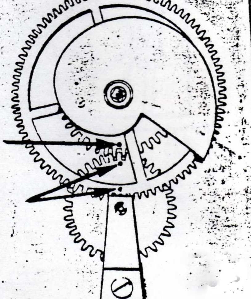 Pour la sonnerie à râteau il y a également des petits signes conventionnels qui facili-tent le réglage de la sonnerie. Une petite creusure conique et borgne est ménagée sur la chaussée, la roue de renvoi ainsi que sur la roue de canon; Lors du remontage il suffit de mettre en regard les deux points de la chaussée et de la roue de renvoi et de mettre le point de la roue de canon en regard de l'aile du renvoi de minuterie. La sonnerie est parfaitement réglée.
