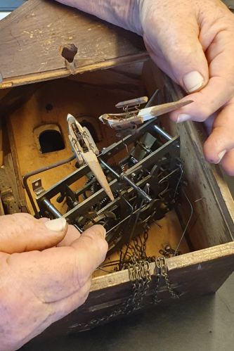 Restauration d'un joli coucou avec un mécanisme à trois soufflets et deux oiseaux.