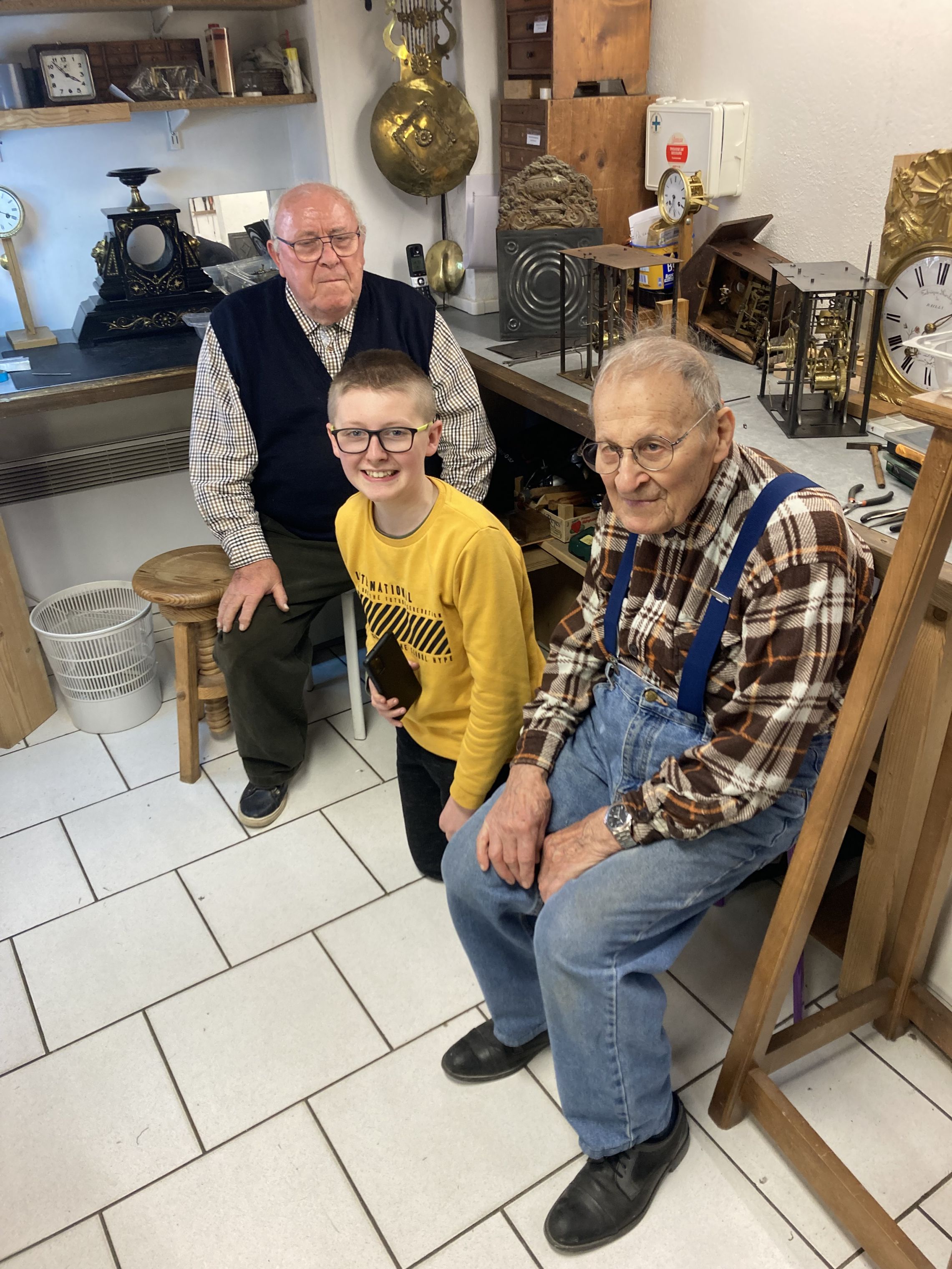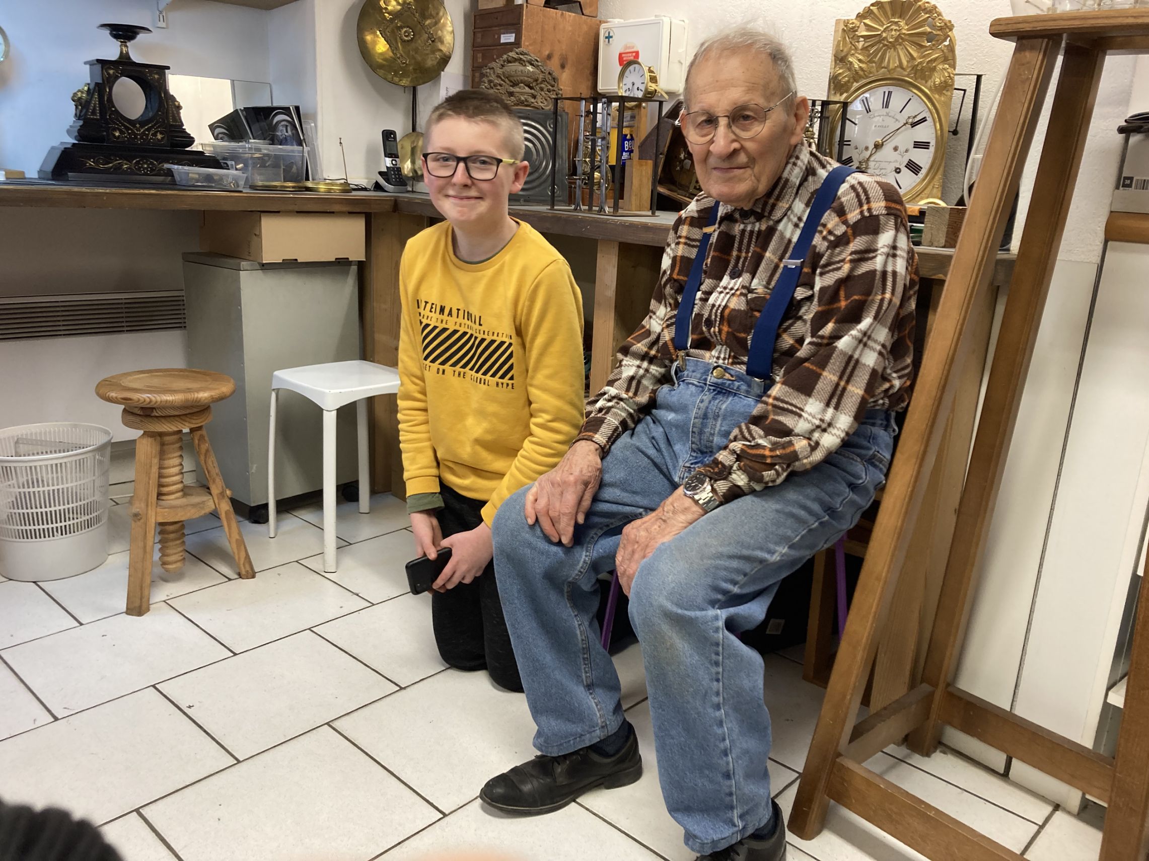 Ici, Ethan avec notre doyen des membres de l'atelier à pendule, Henri. Plusieurs décennies les séparent mais ils ont la même passion...