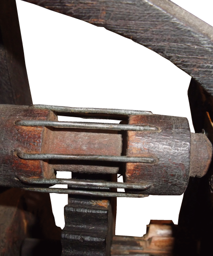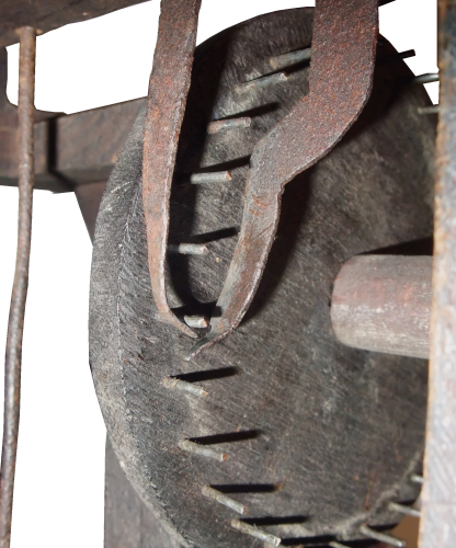 Il est composé d’un mouvement entre deux platines, l’énergie est fournie par un poids logé dans un cabinet qui entraîne un barillet par une corde. Un carré sur ce barillet permet le remontage du poids.
