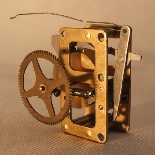 Lorsqu'une pièce est introduite, le levier qui reçoit la pièce se verrouille en bas et dégage le fil du balancier, ce dernier pouvant alors fonctionner normalement.
